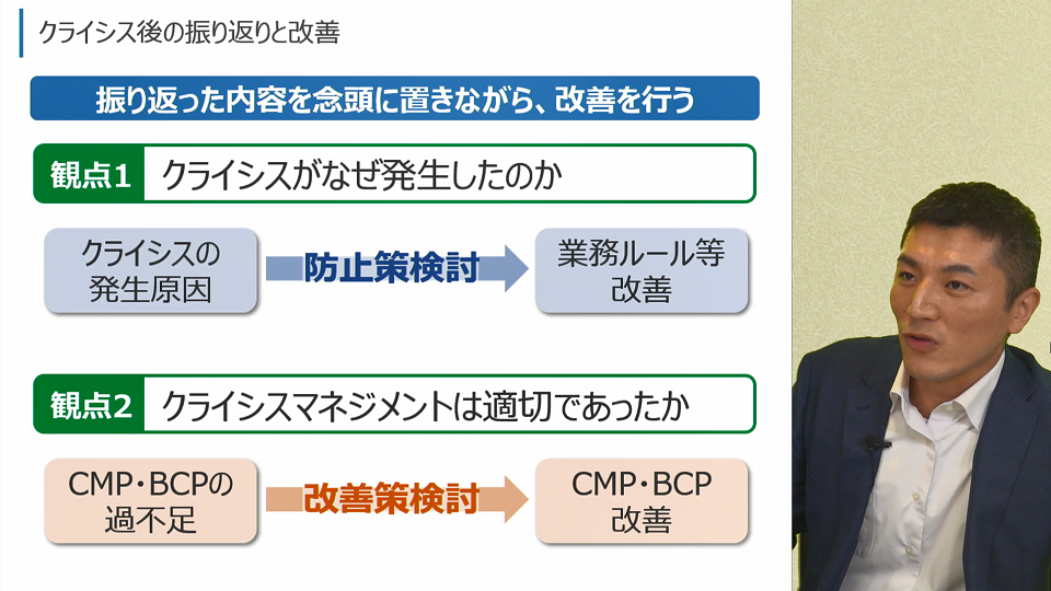 概要 : クライシスマネジメントの概要を説明し、「CMPの作り方」、「CMPの見直し・改善」等の平常時の準備、実際にクライシスが発生した際の対応を、事例を挙げてわかりやすく解説します。