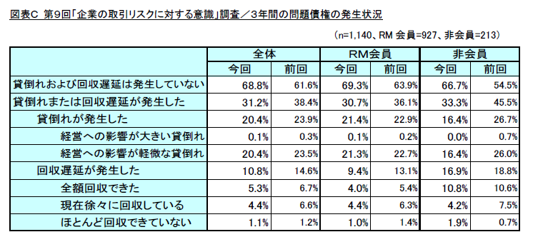 「貸倒れおよび回収遅延が発生した」と回答した区分を見ると、RM会員(回答率30.7%)は非会員(同33.3%)に比べてやや低く、よりリスクを回避できている傾向がうかがえます。(図表C)