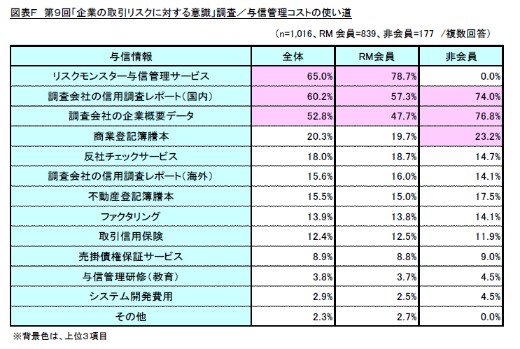 直近1年間の与信管理コストの使い道を調査したところ、最も回答率が高かったのは、RM会員では「リスクモンスター与信管理サービス」(回答率78.7%)、非会員では「調査会社の企業概要データ」(同76.8%)となっており、RM会員においては、リスモンサービスを与信管理の主軸として活用していることがうかがえます。 (図表F)