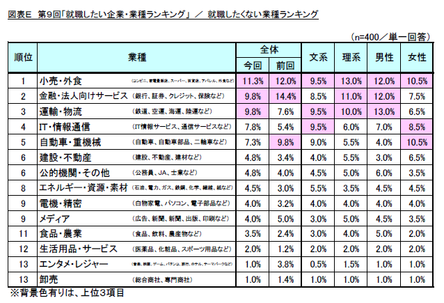 就職したくない業種について集計したところ、「小売・外食」(同11.3%)、「金融・法人向けサービス」、「運輸・物流」(同9.8%)の順となりました。「小売・外食」、「金融・法人向けサービス」の上位2業種は前回順位から変わっていないものの、「金融・法人向けサービス」の回答率は前回から減少し、就職したい業種における回答率が増加していることから、就職先としての評価が良化している業種といえるでしょう。(図表E)