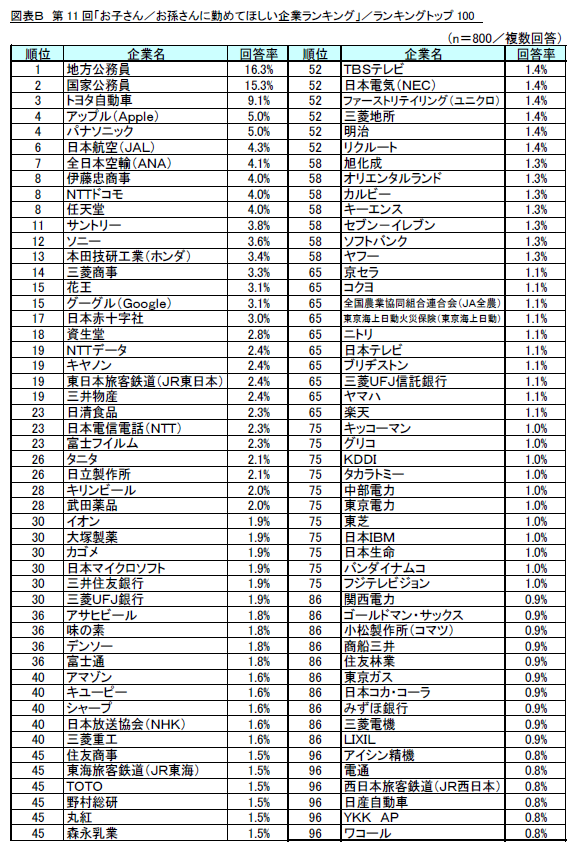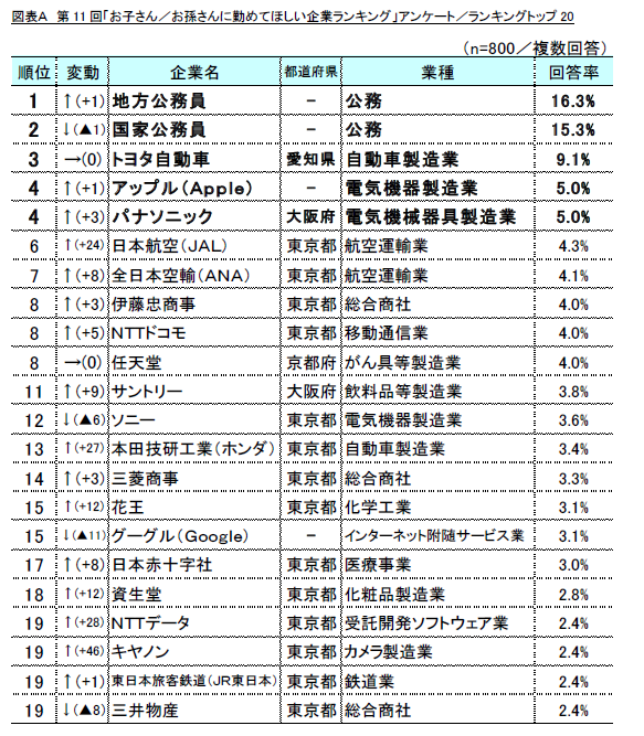 第11回「お子さん/お孫さんに勤めてほしい企業」調査のランキング1位は「地方公務員」(回答率16.3%)となりました。次いで2位「国家公務員」(同15.3%)、3位「トヨタ自動車」(同9.1%)、4位「アップル(Apple)」、「パナソニック」(同5.0%)、6位「日本航空(JAL)」(同4.3%)、7位「全日本空輸(ANA)」(同4.1%)、8位「伊藤忠商事」、「NTTドコモ」、「任天堂」(同4.0%)と続きました。(図表A)