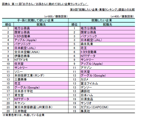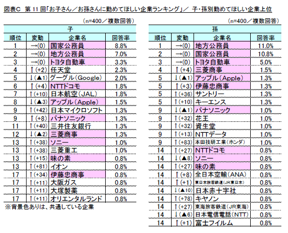 ・調査名称 : 第11回「お子さん/お孫さんに勤めてほしい企業」調査