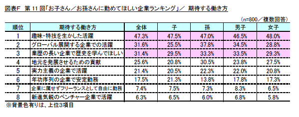 また、本調査の企業ランキングや期待する働き方調査の結果からは、父母・祖父母は、子・孫の勤め先に対して、経営の「安定性」を最も重視しながらも、子・孫や自身の「趣味嗜好」に沿う仕事に就いてほしいという願いや、「グローバルな活躍」ができる企業に就職してほしいという願いがあることが読み取れます。
