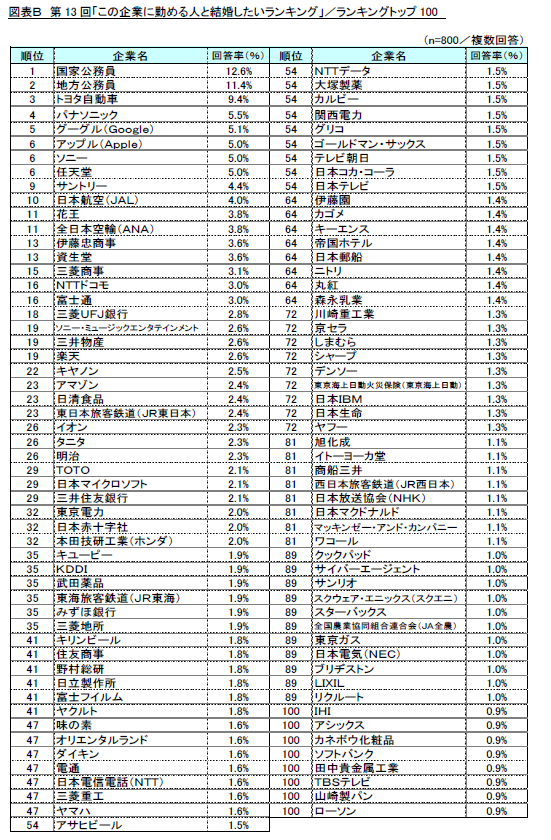 ・調査名称 : 第13回「この企業に勤める人と結婚したいランキング」調査