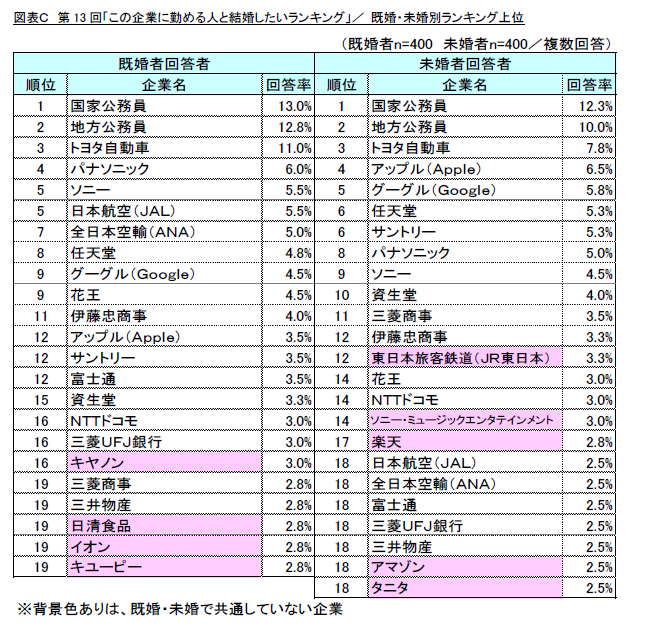 結婚相手の勤務先として望む企業を既婚・未婚別に集計したところ、1位~3位は共通して「国家公務員」、「地方公務員」、「トヨタ自動車」の順となっており、4位以下に関しては、既婚者では4位「パナソニック」、5位「ソニー」、「日本航空(JAL)」、未婚者では、4位「アップル(Apple)」、5位「グーグル(Google)」という結果となりました。