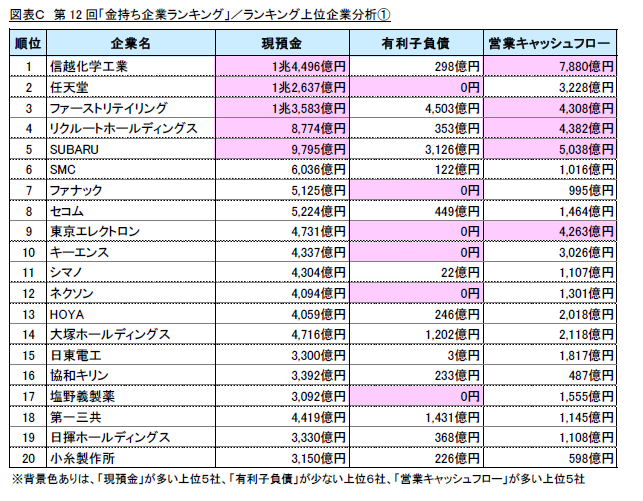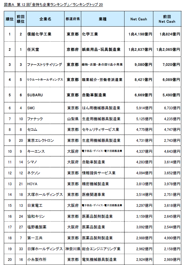 第12回「金持ち企業ランキング」は、1位「信越化学工業」、2位「任天堂」、3位「ファーストリテイリング」となりました。