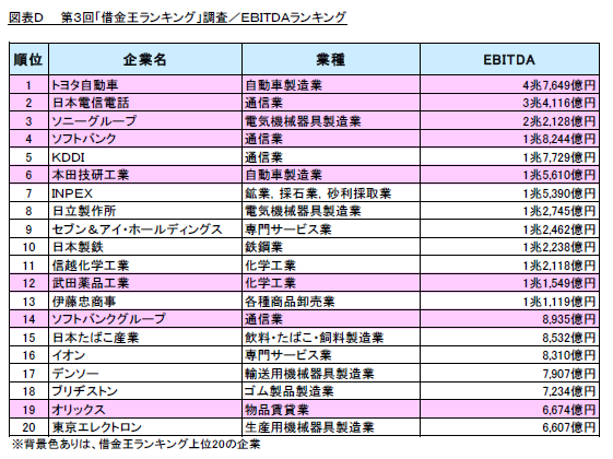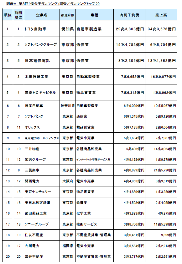 第3回借金王ランキング1位は「トヨタ自動車」、2位「ソフトバンクグループ」、3位「日本電信電話」の順となりました。