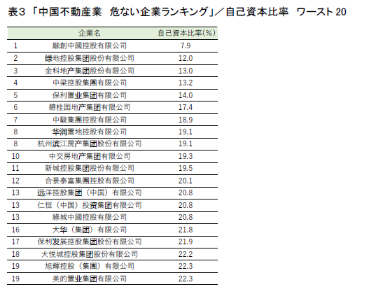 ワースト1位の「融創中國控股有限公司」では、自己資本比率が10%を下回っており、資金調達が困難な状態に陥っている恐れがあります。(表3)