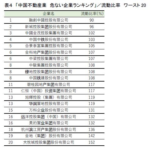 ワースト1位の「融創中國控股有限公司」、ワースト2位の「新城控股集团股份有限公司」においては、流動比率が100%以下であり、流動負債に対する返済原資が不足していることがわかります。(表4)