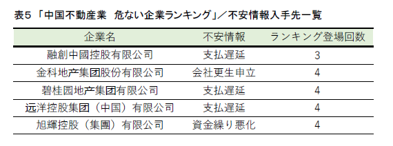 調査対象39社のうち、現時点で不安情報を入手している企業は5社となっています。不安情報を取得している企業は、調査対象の39社の中でも純利益率や自己資本比率が特に低く、収益性や安全性の悪化がうかがえる上、入手している不安情報も「支払遅延」など、資金繰りの悪化に関するものであるため、倒産の危険性が高い状態といえます。なお、中には「金科地产集团股份有限公司」のように、既に倒産に至っている企業も含まれています。(表5)