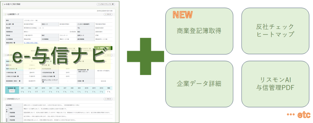 「e-与信ナビ」で提供している企業概要情報やRM格付のほかに、追加機能として、決算情報や株主等の詳細情報を掲載した「企業データ詳細」や、コンプライアンスリスクを視覚化して提供する「反社チェックヒートマップ」、対象企業の最新情報をレポーティングした「リスモンAI与信管理PDF」などを提供しており、調査対象企業を一度検索するだけで、取引判断に必要な情報をご利用用途に応じてワンストップで取得できます。また、取得した情報は企業データとしてひとまとめに保存することができますので、調査システムのシンプル化や事務作業の効率化、取引先情報の一元管理が可能です。