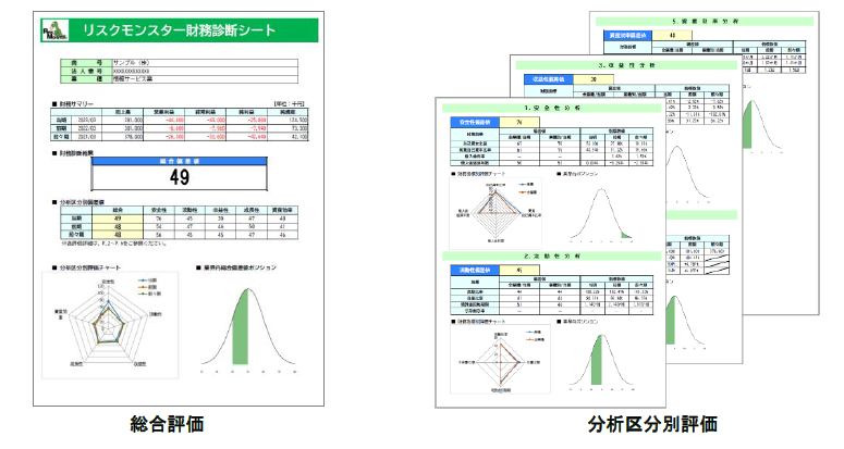 『リスクモンスター財務診断シート』は、企業の決算情報を安全性/流動性/収益性/成長性/資産効率の5つの観点から多角的に分析し、リスモンの540万社超の企業データベースが保有する豊富な決算情報との比較により、財務診断の結果を業界での全国順位に基づく「偏差値」を記したものです。