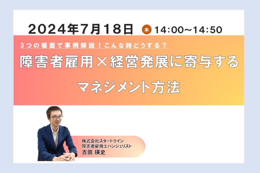 また、本シリーズを監修した株式会社スタートライン 障害者雇用エバンジェリスト 吉田瑛史氏が登壇する特別セミナーを2024年7月18日(木)に開催いたします。障害者マネジメントにおいて、トラブルやミスが起きやすい「新規業務依頼時」、「繁忙期」、「体制変更時」の3つの場面での事例を解説します。参加費無料のセミナーですので、ぜひご参加ください。