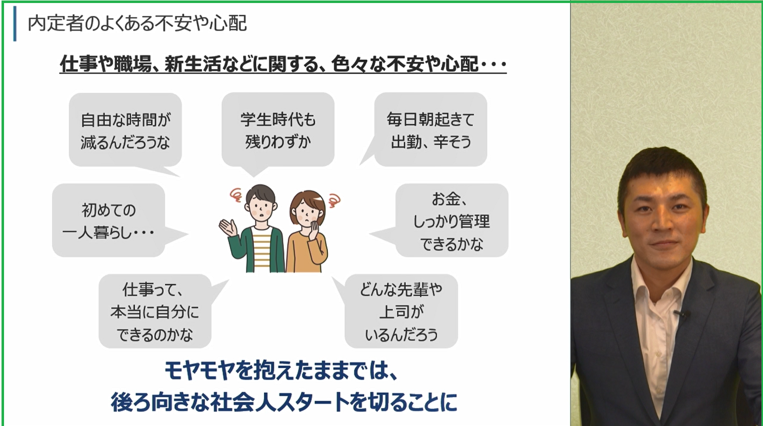 今回追加するeラーニング「社会人準備講座 内定者に役立つ知識と実践すべきアクション」は、それらのご要望にお応えし、「入社までに何をしておくべきか」「習慣化しておくべき生活リズム」「社会人になるまでに知っておきたいこと」など、内定者が不安に感じていることを解消するとともに、残りの学生時代を悔いなく過ごすためのプランの立て方を学ぶ内容となっています。