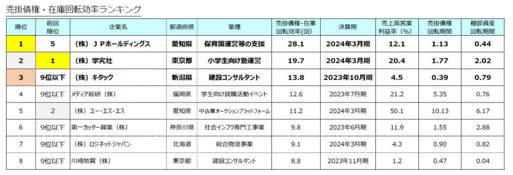 ■「売掛債権・在庫回転効率」種目の1位は、保育園運営事業の(株)JPホールディングス