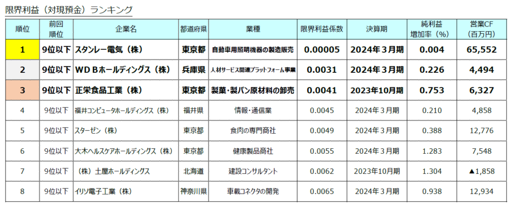 (4)利益をキャッシュ化する力!限界利益係数(対現預金) ランキング