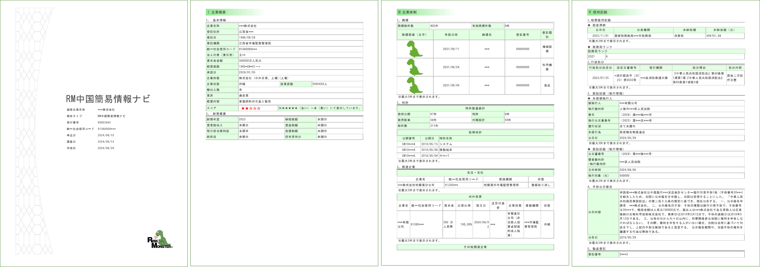 「RM中国企業情報ナビ」は、中国現地に拠点を持つリスモングループ会社が、中国国内の企業調査を専門に行う信用調査会社との提携により提供する中国企業信用調査レポートサービスです。レポートには、中国企業の基本情報、沿革、代表者情報、許認可情報、訴訟情報、取引先情報などが掲載されるほか、これらの情報をリスモンが独自ノウハウで分析し算出した信用評価指標「RM格付・RM与信限度額」も提供しています。日本企業と同じ基準で与信判断ができる点や、日本語への翻訳料不要で、高品質なレポートを安価に取得できる点で、これまでご好評をいただいております。