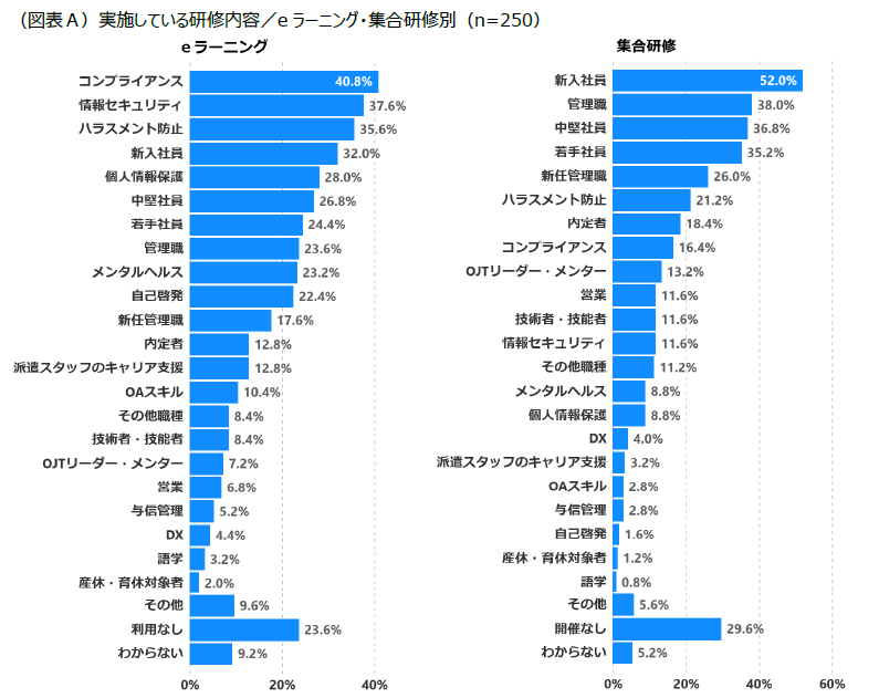 一方で集合研修では、「新入社員研修」(同52.0%)が最も多く、次いで「管理職研修」(同38.0%)、「中堅社員研修」(同36.8%)となりました。(図表A)