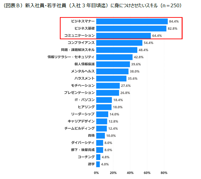 新入社員・若手社員に身につけさせたいスキルを聞いたところ、「ビジネスマナー(マナー、電話・メール対応、文書作成など)」(回答率 84.4%)、 「ビジネス基礎(社会人基礎力、タイムマネジメント、PDCAなど)」(同 82.8%)、 「コミュニケーション」(同 64.4%)の順に回答が多く、どの職種にも求められる基本的なスキルを重視していることがわかりました。(図表B)