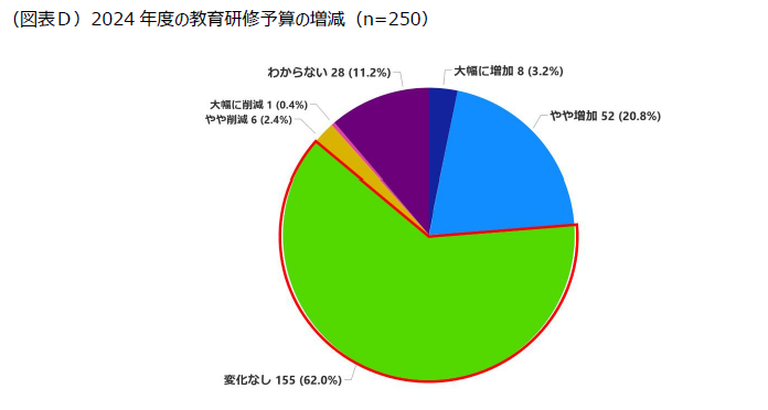 2024年度の教育・研修予算について聞いたところ、前年度と比較して「変化なし」(構成比 62.0%)、「増加(大幅に増加+やや増加)」(同 24.0%)、「削減(大幅に削減+やや削減)」(同 2.8%)となり、予算に変動がないという回答が多い結果となりました。教育・研修の予算を一定に保ち、社員への投資を継続している企業が過半数以上を占めております。 (図表D)