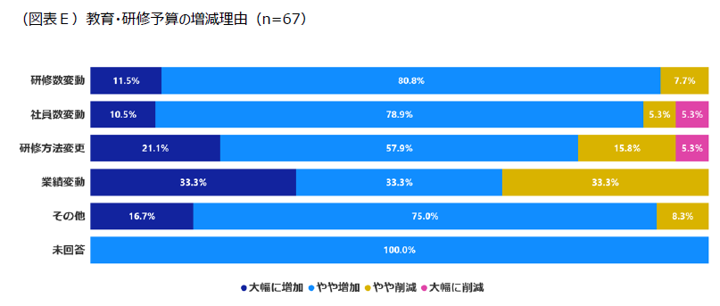 教育・研修予算に増減があった場合の理由をまとめたところ、予算が「増加(大幅に増加+やや増加)」した理由としては「研修数変動」(同92.3%)、「社員数変動」(同89.4%)が多く、研修の実施数や対象となる社員の増加が、予算拡大の主な要因であると考えられます。 (図表E)