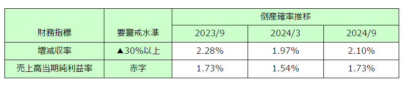 経済環境や景気動向の変化により、倒産のトレンドは常に変化しています。下表のとおり、2023/9から2024/9の1年間で比較すると、各財務指標における要警戒水準の倒産確率も変化が生じていることが分かります。これらの倒産トレンドの変化に対応するために、定期的に倒産実績の集計を行い、格付と倒産確率の乖離が生じないように調整を行っています。