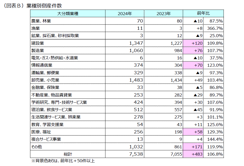 ●業種別動向:18業種中11業種で倒産件数が増加。「卸売業、小売業」(1,483件 前年比+49件)、「建設業」(1,347件 同+120件)、「製造業」(1,060件 同+76件)において、倒産件数の多さや増加が目立っています。一方、「宿泊業、飲食サービス業」(512件 同▲45件)は前年から最も減少しました。