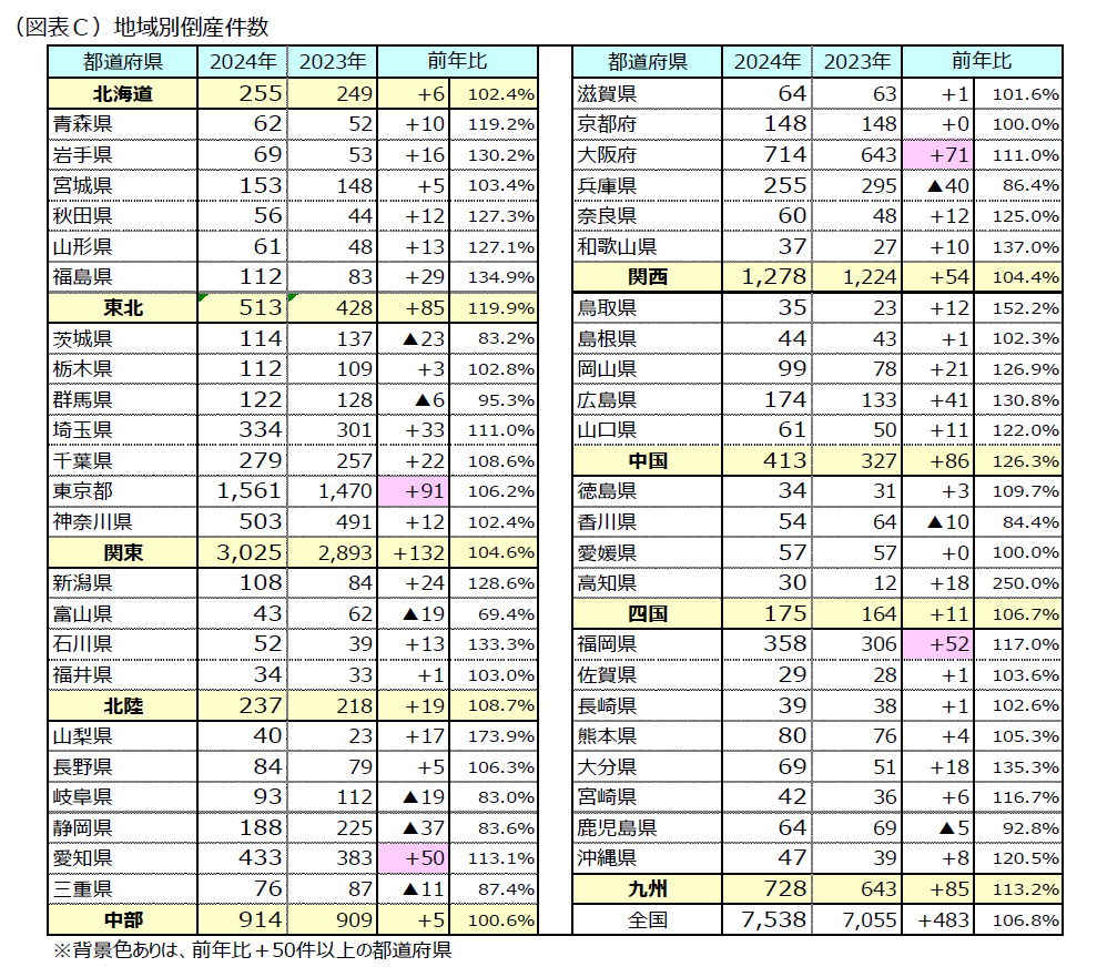 都道府県別では、38の都道府県で倒産件数が前年を上回り、特に「東京都」(1,561件 前年比+91件、106.2%)、「大阪府」(714件 同+71件、111.0%)、「福岡県」(358件 同+52件、117.0%)、「愛知県」(433件 同+50件、113.1%)、「広島県」(174件 同+41件、130.8%)など大都市で倒産件数の増加が目立っています。(図表C)