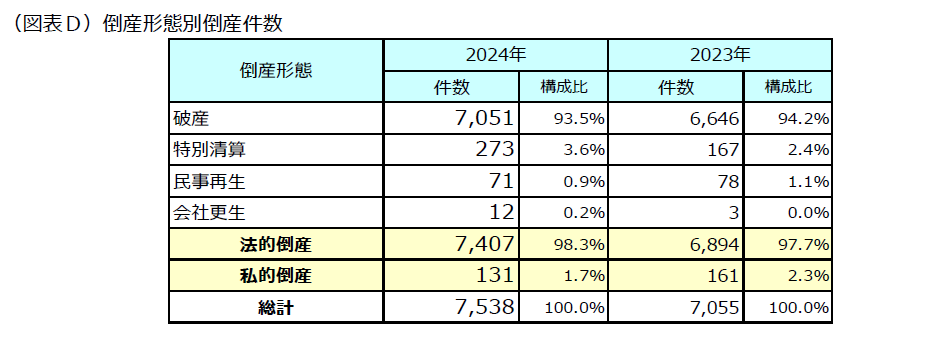 倒産形態別にみると、「法的倒産」がほとんどを占めています。手続きの種類としては、「破産」(7,051件)が全体の93.5%を占め、「特別清算」(273件)を含めた場合、「清算型」倒産手続きが全体の97%を超えています。一方、「民事再生」や「会社更生」の「再建型」倒産手続きは、わずか1%程度に留まっています。(図表D)
