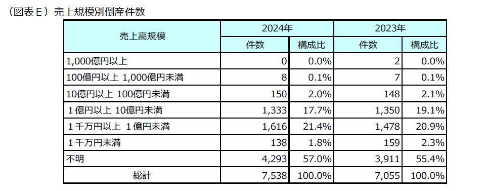 また、売上高が不明の企業倒産が6割程度を占めており、情報開示姿勢の観点から中小・零細企業である可能性が高いと想定されます。「10億円未満」の倒産件数と合わせた場合、98%近い倒産が中小・零細企業から発生しているものと考えられます。(図表E)