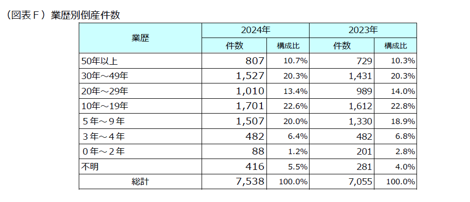 また、「50年以上」(構成比10.7%)の老舗企業では、10年単位での比較では最も倒産割合が低く、経営が安定している企業が多い様子がうかがえます。(図表F)