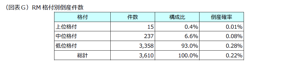 リスモンが提供する企業の信用力を示すRM格付(6段階の格付を3区分に分類)別に見た場合の倒産件数は、「低位格付」(3,358件 構成比93.0%)が90%超を占めています。倒産確率をみると、低位格付(倒産確率0.28%)は上位格付(同0.01%)の30倍近く高く、低位格付先は倒産リスクに注意が必要であることがわかります。(図表G)