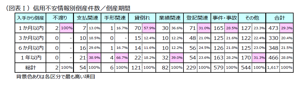 倒産企業のうち、1年以内に信用不安情報を入手した企業において、入手から倒産に至る期間とその内容を集計したところ、3割近い企業は信用不安情報の入手から「1か月以内」(合計473件 構成比29.3%)に倒産する結果となりました。特に、資金ショートが表面化している「不渡り」や、連鎖倒産のリスクが生じる「貸倒れ」、債権譲渡登記や差押え登記等の「登記関連」の不安情報では、情報の入手から倒産に至る期間が短いため注意が必要といえます。(図表I)