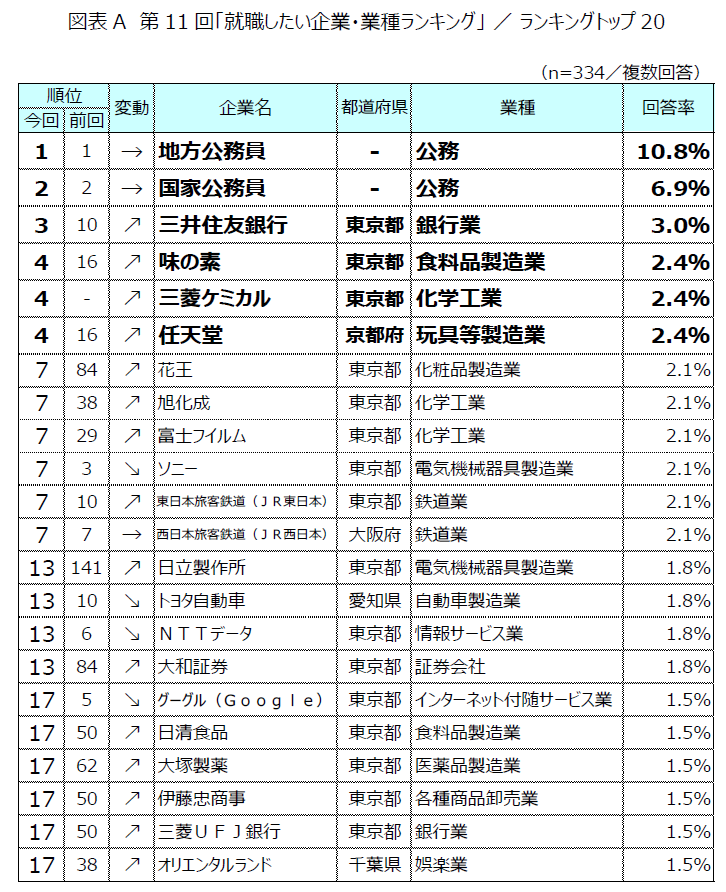 第11回「就職したい企業・業種ランキング」発表! ~選定ポイント「勤務地」が初の1位、公務員人気は依然健在もトップ20の半数が入れ替わり~