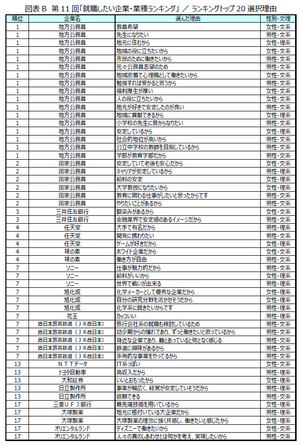就職したい企業の選択理由を尋ねたところ、1位「地方公務員」、2位「国家公務員」では、「安定している」、「地元・国に貢献したい」という意見のほか、自身の夢の実現に関する回答が多くみられました。トップ20内の民間企業においては、「有名だから」、「憧れがあるから」、「商品やサービスに興味・馴染みがあるから」といった意見などがみられ、企業の知名度やイメージ、商品・サービスへの興味等が就職希望に繋がっている様子が読み取れます。(図表B)