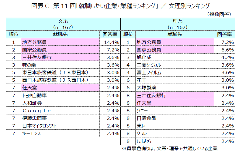 文系と理系の両方にランクインした企業は公務員を除くと2社に留まっています。理系では化学工業や製造業など、自身が大学で学んだ知識を活かせる専門性の高い業種が多いのに対して、文系の方が多様な業界にわたっており、傾向に差が表れています。(図表C)