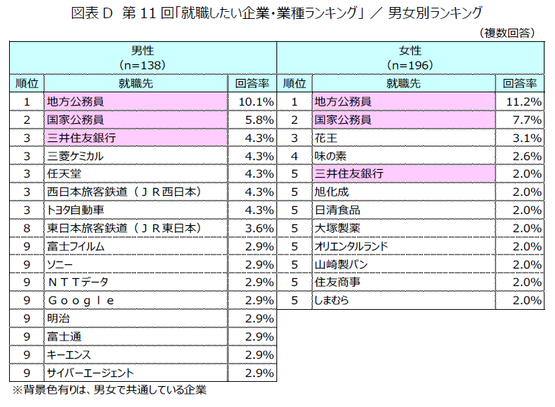 男女別では、男女ともにランクインしているのは「地方公務員」、「国家公務員」、「三井住友銀行」の3つのみであり、男性では機械系の製造業や鉄道業が多いのに対して、女性では食料品製造業が上位に目立つなどの違いが表れています。(図表D)
