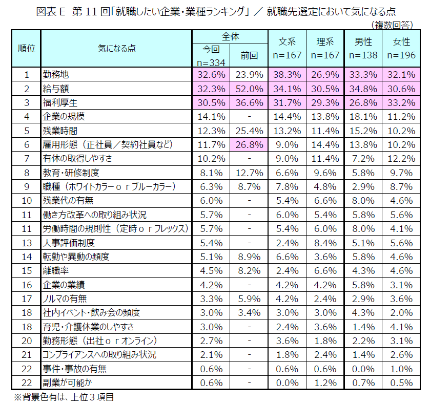 就職先の選定において気になる点について尋ねたところ、1位「勤務地」(回答率 32.6%)、2位「給与額」(同32.3%)、3位「福利厚生」(同30.5%)となりました。今回調査では「勤務地」が、第3回調査から不動の1位であった「給与額」を上回り1位になった点が大きな特徴といえ、社会人生活をどの地域で過ごすのかが重視されている様子がうかがえます。(図表E)