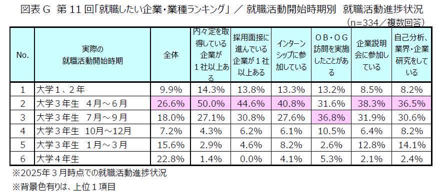 さらに、理想通りに「大学3年生前期」までに就職活動を開始した学生においては、9割以上が内々定を獲得していることもわかりました。(図表G)