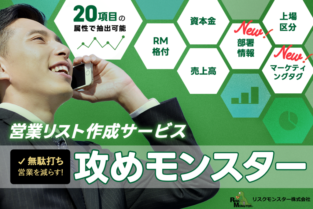 与信管理クラウドサービスを提供するリスクモンスター株式会社(本社:東京都中央区、代表取締役社長:藤本太一、以下リスモン)は、ターゲット企業に“狙い撃ち”でアプローチできる営業アタックリスト作成サービス「攻めモンスター」を2025年7月20日にリニューアルいたしました。
