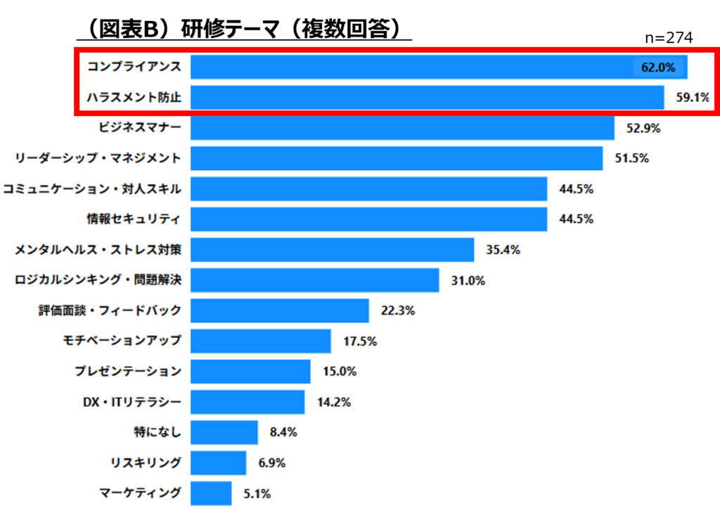 実施テーマの上位は「コンプライアンス」(62.0%)、「ハラスメント防止」(59.1%)、「ビジネスマナー」(52.9%)、「リーダーシップ・マネジメント」(51.5%)となりました(図表B)。