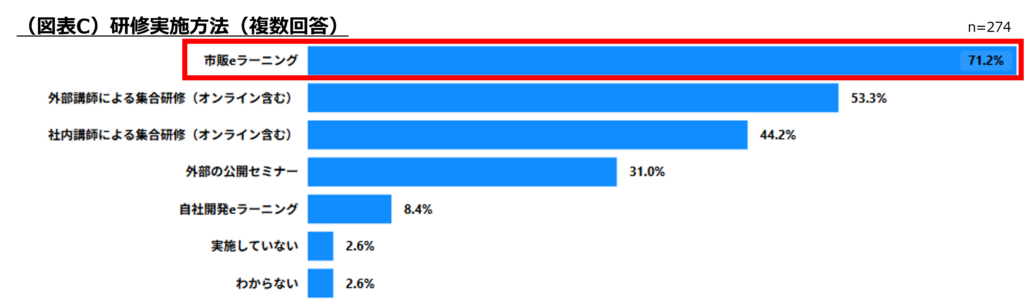 研修方法は「市販のeラーニング」(71.2%)の利用が最多で、「自社開発eラーニング」は8.4%と少数でした。(図表C)