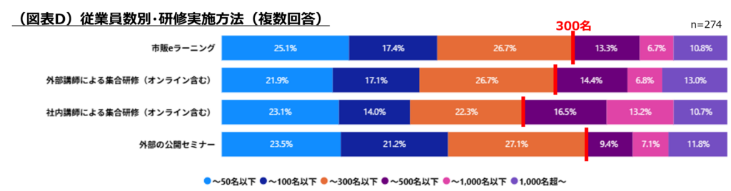 上位4項目を従業員数別で見ると、300名以下の企業では「外部の公開セミナー」、301名以上では、オンラインを含む「外部講師・社内講師による集合研修」が多く採用される傾向が見られました。(図表D)