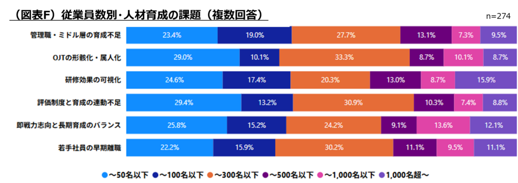 ●人材育成の最大の課題は「管理職・ミドル層の育成不足」。全体の約半数が課題と回答し、特に従業員300名以下の企業では約7割が問題意識を持つ結果となりました。