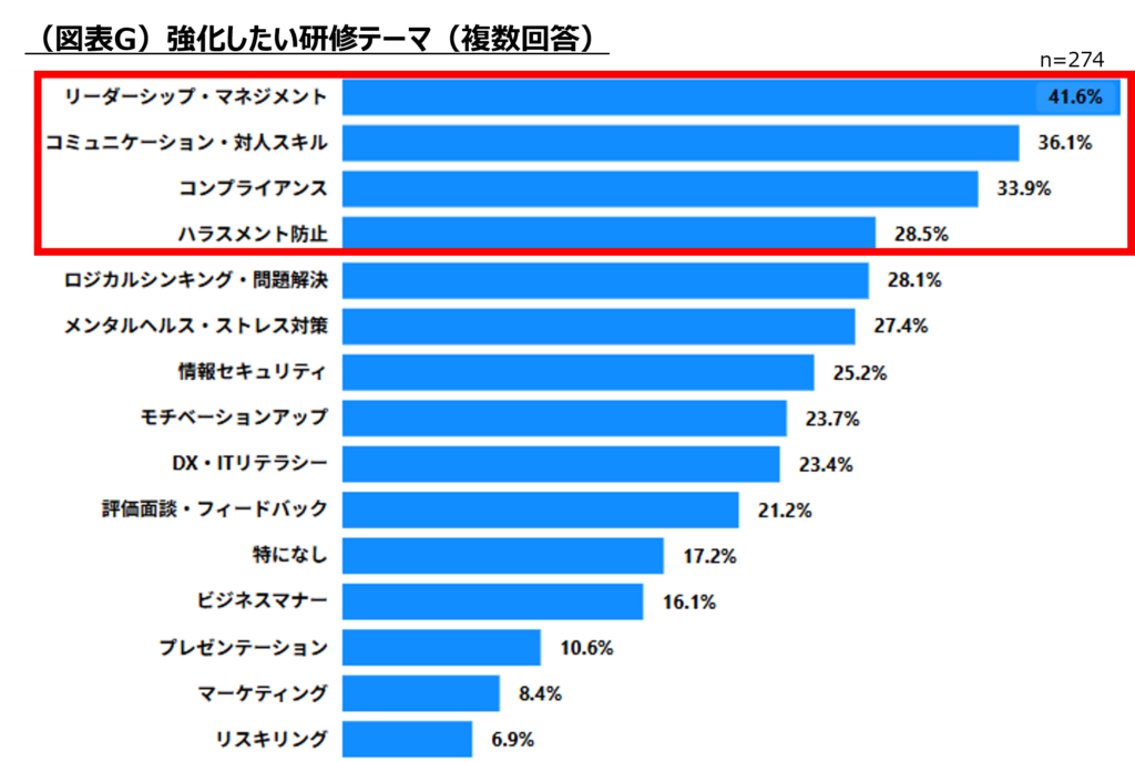 また、今後強化したいテーマとして「リーダーシップ・マネジメント」「コミュニケーション・対人スキル」が上位に挙がり、管理職層の育成ニーズの高まりが浮き彫りとなりました。