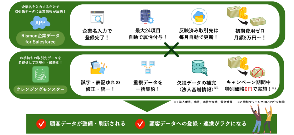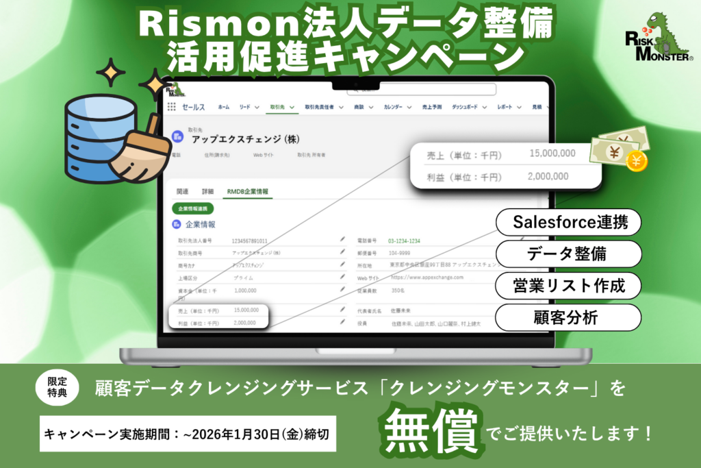 「Rismon企業データfor Salesforce」を新規でお申し込みいただいたSalesforceユーザー企業様に、顧客データクレンジングサービス「クレンジングモンスター」を無償提供します。