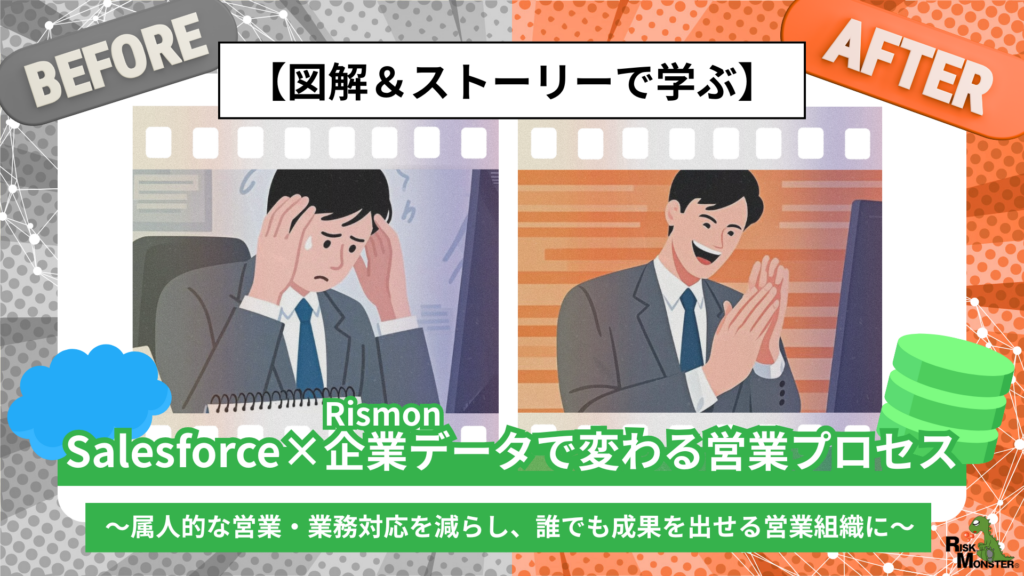 ▼Rismon法人データソリューションを解説した「【図解&ストーリーで学ぶ】Salesforce x Rismon企業データで変わる営業プロセス」のお役立ち資料はこちら