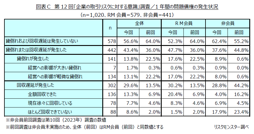 直近1年間の貸倒れ・回収遅延の発生状況を聞いたところ、「貸倒れまたは回収遅延が発生した」と回答した企業は全体の43.4%となり、前回調査を7.4ポイント上回りました。