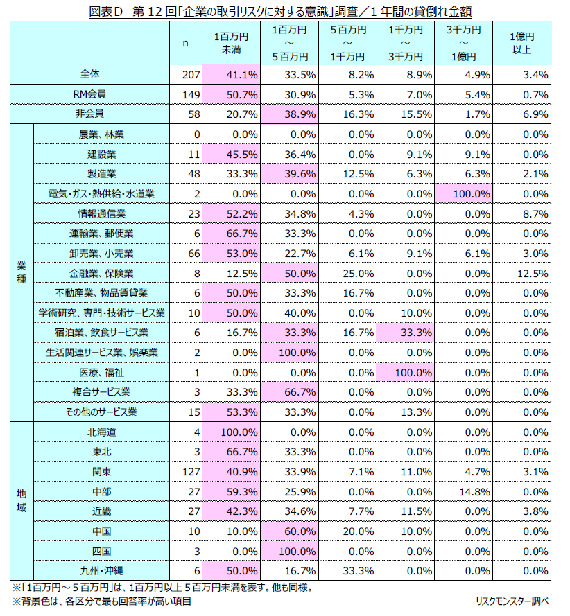 会員属性別に見ると、RM会員では貸倒れ金額が少額にとどまる傾向が強く表れている一方で、非会員では「5百万円以上」が4割超を占めるなど、高額となる傾向が明確に表れています。(図表D)