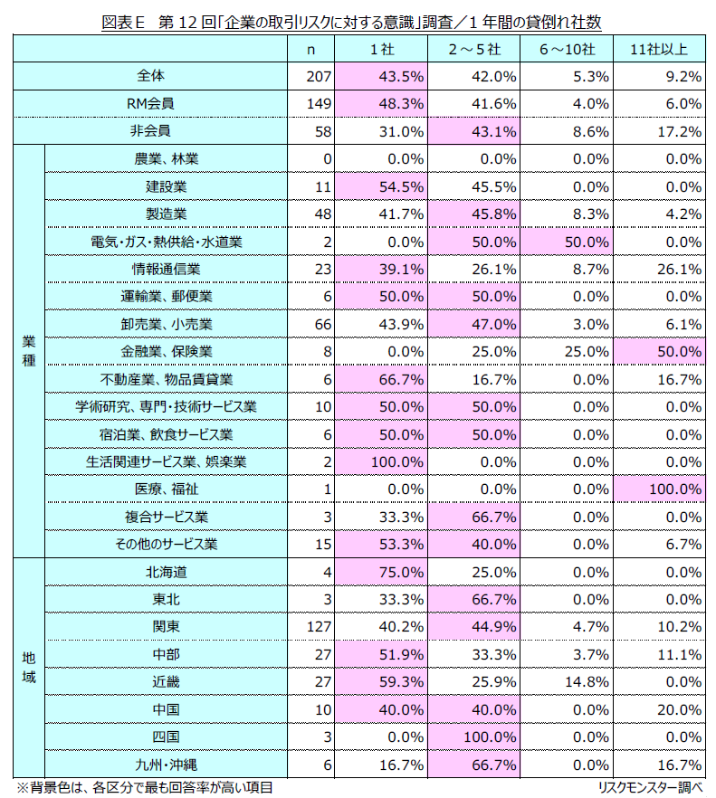 特に、RM会員では、約半数が「1社」にとどまっているのに対して、非会員では、約25%が「6社以上」と回答しており、貸倒れ発生件数でも大きな差が生じています。(図表E)
